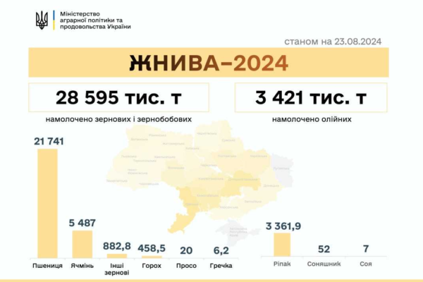В Україні намолочено 32,02 млн тонн нового врожаю, який зібраний на площі 8 040,3 тис. га. Аграрії