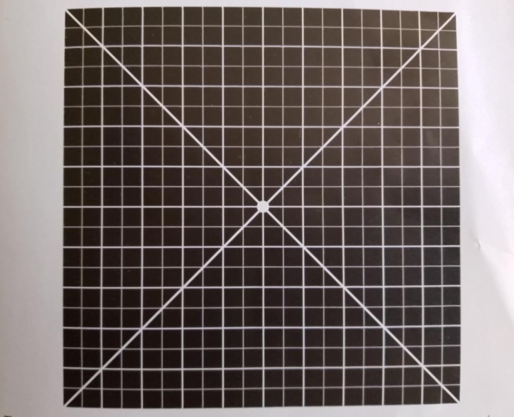 1. Прикрийте одне око. Зосередьте погляд (не примружуючись) на центральній крапці, оцініть інші частини сітки.