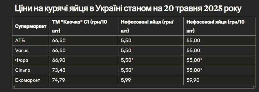 Згідно з актуальними даними, станом на 20 травня 2025 року середня ціна на небрендовані яйця у великих мережах супермаркетів становить близько 55 грн за десяток. Водночас фасовані яйця різних брендів коштують дорожче.